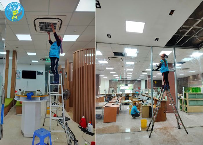 Công việc được tiến hành theo thứ tự từ trên xuống dưới, từ trong ra ngoài. Các khu vực như trần nhà, kính, tường được làm sạch trước, sau đó đến sàn nhà và khu vực công cộng. Nhân viên tuân thủ quy trình an toàn, đặc biệt khi làm việc trên cao.